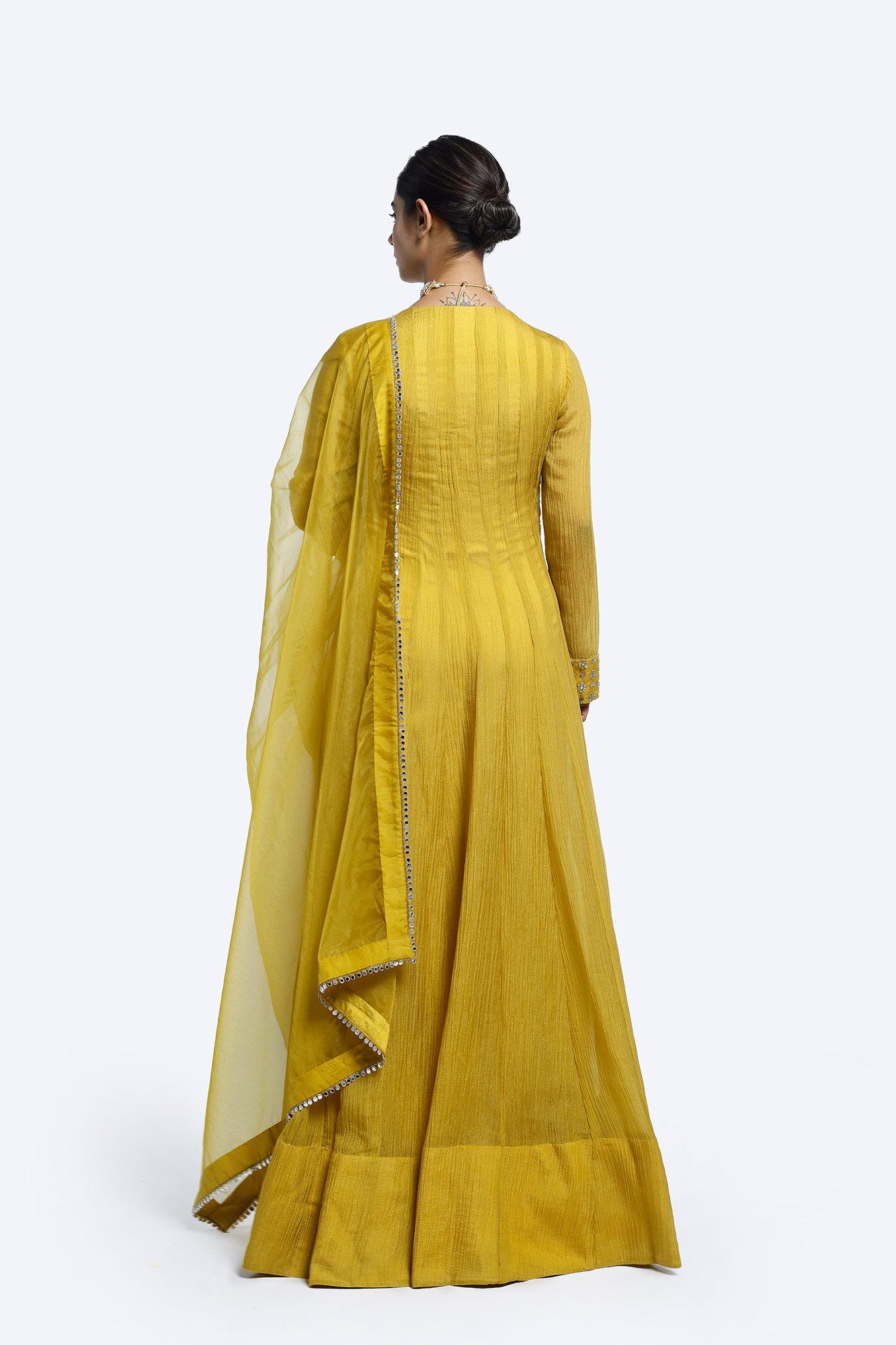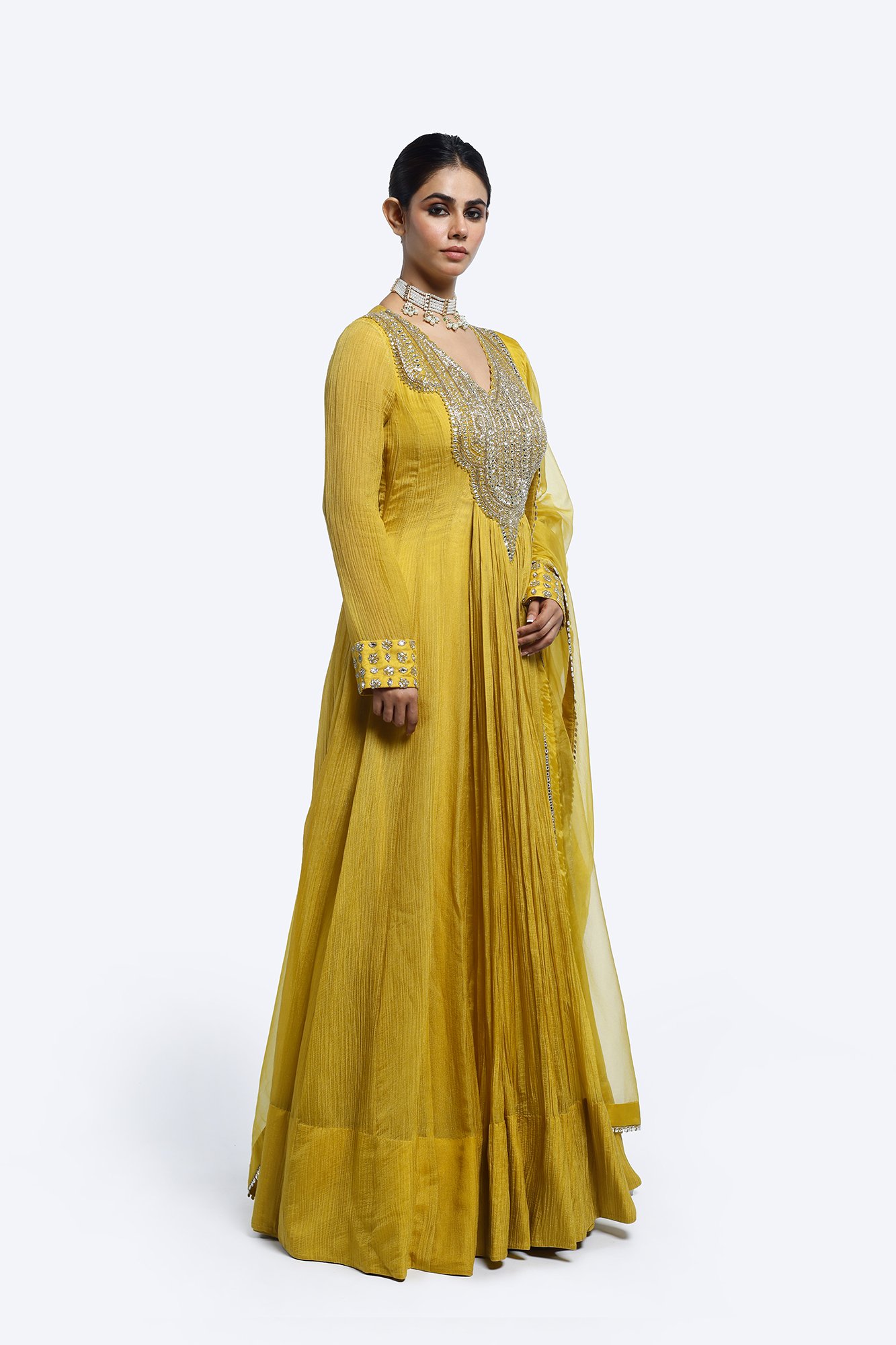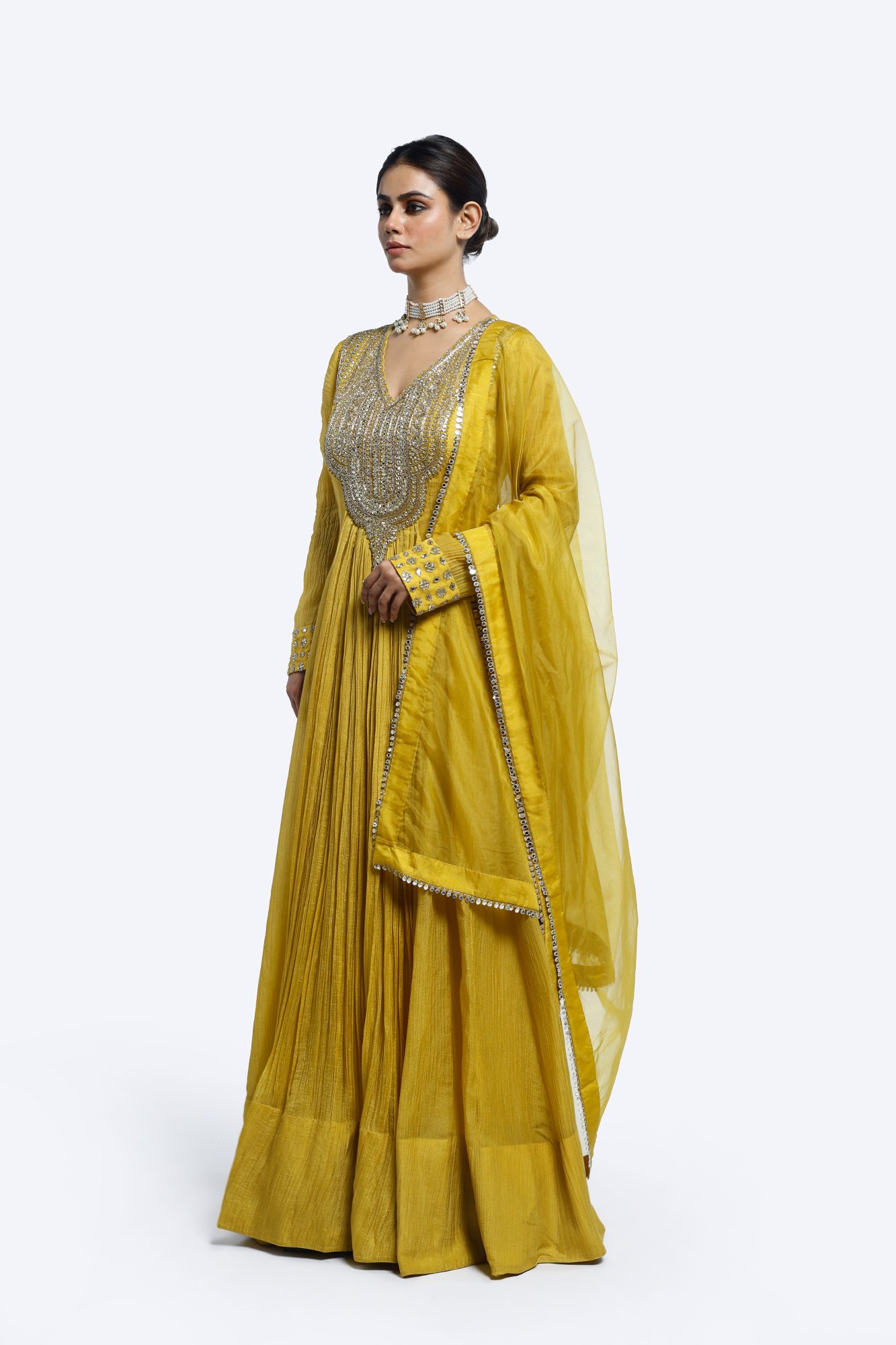 Designer Mustard Mirror Work V-Neck Organza Crush Suit Set with Dupatta