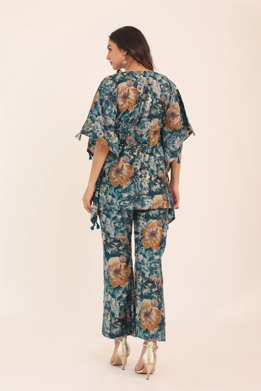 • The V-neckline of the kaftan top adds a touch of allure, creating a flattering and modern silhouette.